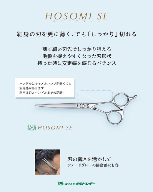 その名に相応しく、HOSOMIの長所である「細く薄い」を更に強化したシザーです。
