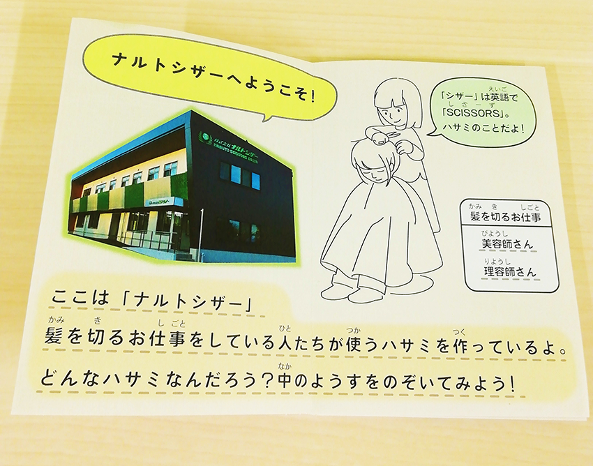 来られた子供たち皆にナルトシザーからプレゼントを用意。ナルトシザーのことが簡単にわかる「ナルトシザー学習帳」と「オリジナルのばんそうこう」です。