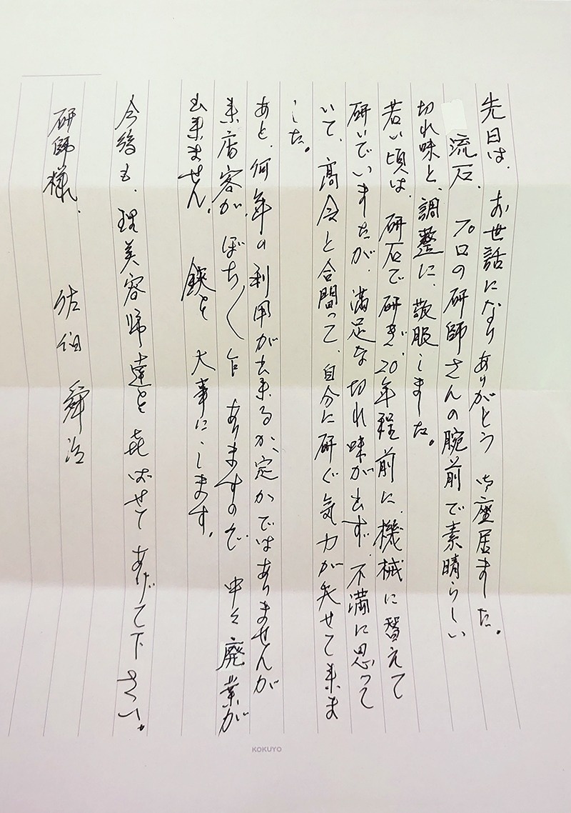 佐伯さま、ハサミの研ぎ・調整はご心配なく、どうぞいつまでもお元気で。