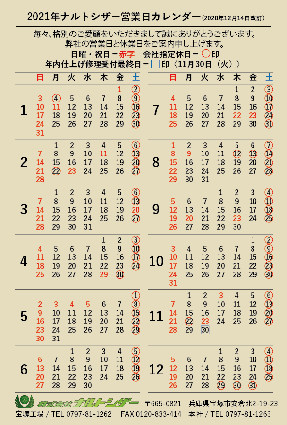 2021年ナルトシザー営業日カレンダーを代理店各位に送付いたしましたが、12月4日に内閣府より、令和3年(2021年)に限り、 「海の日」は7月22日に、 「スポーツの日」は7月23日に、 「山の日」は8月8日と発表されました。 従いまして、ナルトシザーの営業日も変更いたしました。ご確認くださいませ。