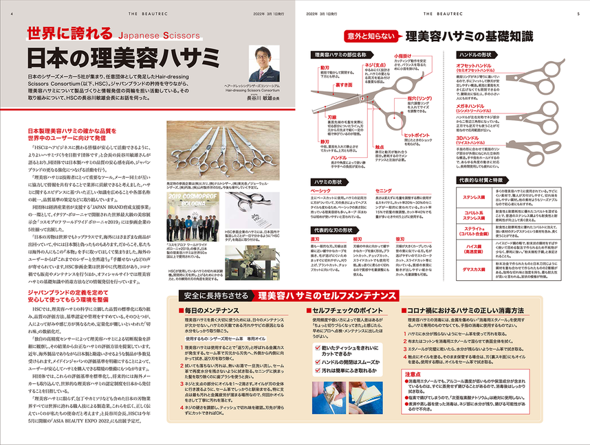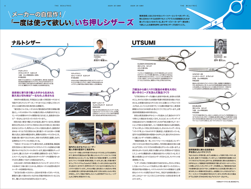 特集記事「美容技術者をとりこにする刃物」では、ナルトシザーズの使用感や現場の生の声を読むことができます。