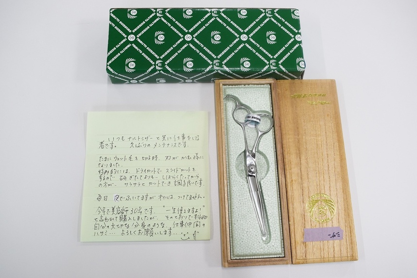 お手紙と一緒に届いた一丁のハサミ、桐箱には“大切”の文字。 励みになるメッセージが添えられていました。 「いつもナルトシザーと共に仕事をしている者です。久しぶりのメンテナンスです。 〜 今年で美容師30年です。“一生使えますよ”と言われて購入しましたが、そのとおりですね♡ 自分の大切な分身のような仕事仲間のハサミ...よろしくお願いします。」 今後ともナルトシザーをどうぞよろしくお願いいたします。